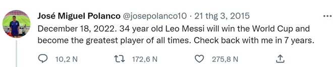 Sau khi Argentina đăng quang, bài đăng của Polanco đã thu hút hơn 276.000 lượt thích, hơn 106.000 lượt chia sẻ trên nền tảng mạng xã hội Twitter.