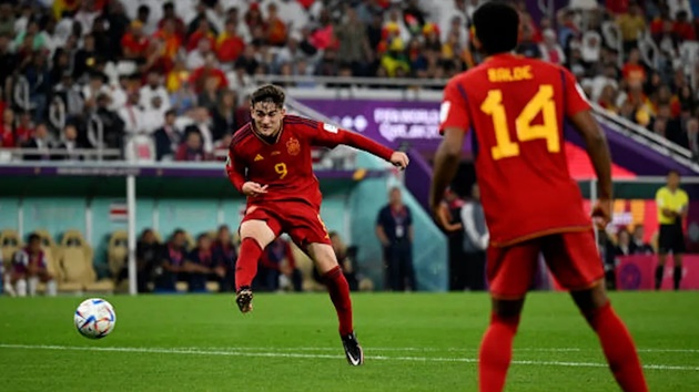 Ngày Tây Ban Nha hủy diệt Costa Rica 7 bàn không gỡ, tài năng trẻ Gavi đánh dấu trận ra mắt World Cup bằng siêu phẩm. Từ đường tạt của Alvaro Morata, khi bóng còn trên không trung, Gavi vung chân dứt điểm kỹ thuật bằng má ngoài.