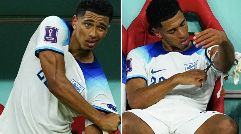 Jude Bellingham đá 76 phút trước khi nhường chỗ cho Mason Mount. Trên băng ghế dự bị, ngôi sao trẻ của Dortmund gặp khó với việc tháo chiếc băng cánh tay. Ban đầu, cầu thủ sinh năm 2003 dùng tay xé nhưng không hiệu quả. Sau đó, anh phải dùng một chiếc kéo mới thành công.