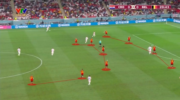 Croatia không gây áp lực quá mạnh mẽ khi phòng ngự nhưng khối giữa sân của họ đã thực hiện chuẩn mực các hành động ngăn chặn và tiếp cận để chia cắt hệ thống của Bỉ. Kevin De Bruyne và Leandro Trossard, hai cầu thủ sáng tạo của Bỉ, gần như bị chia cắt hoàn toàn khỏi hệ thống.