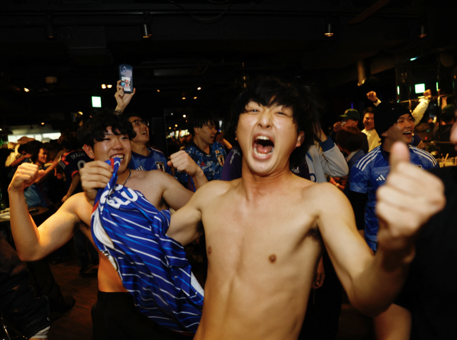 Cổ động viên Nhật Bản cởi áo ăn mừng ngay tại quán bar ở thủ đô Tokyo sau khi đội tuyển của họ giành quyền vào vòng 16 đội World Cup 2022. Đây là điều không thường thấy với người Nhật ngay cả khi đó là những người hâm mộ bóng đá.