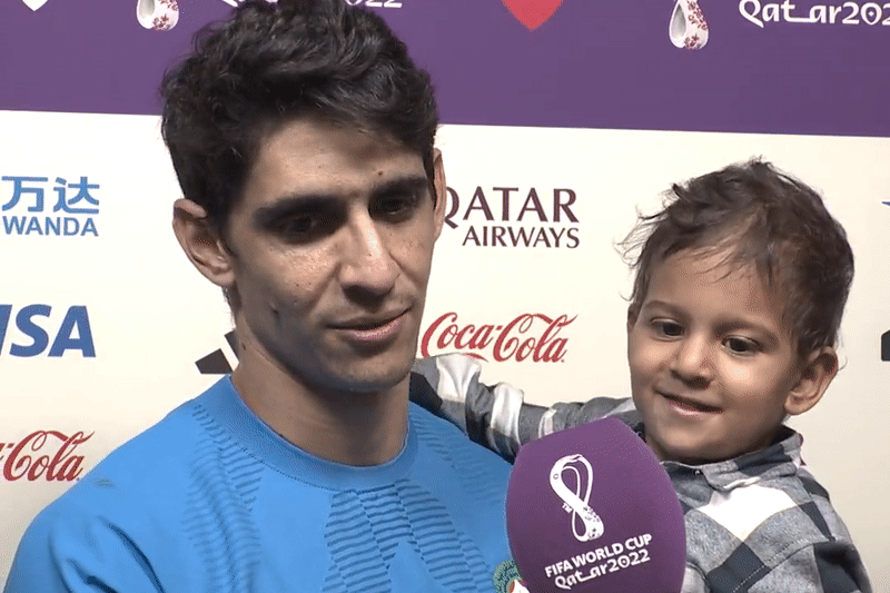 Thủ môn Bounou bế con trai trong buổi phỏng vấn sau trận thắng của tuyển Morocco trước Bồ Đào Nha để lần đầu tiên trong lịch sử góp mặt tại bán kết World Cup. Thủ thành của Sevilla trở thành chốt chặn vững chắc, có những pha cứu thua ấn tượng khiến các chân sút đối phương nản lòng.