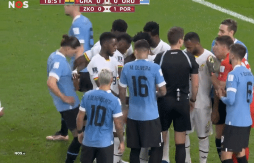 Darwin Nunez đứng ở phía ngoài nhưng vẫn chọc chân vào với ý định khiến điểm đặt bóng không còn bằng phẳng. Hành động của tiền đạo trẻ đang chơi cho Liverpool bị phát hiện. Hai cầu thủ của Ghana đã nổi giận và đẩy Nunez ra xa. Tình huống diễn ra ngay trước mắt trọng tài chính. Ông Siebert đã rút thẻ vàng cho Nunez.