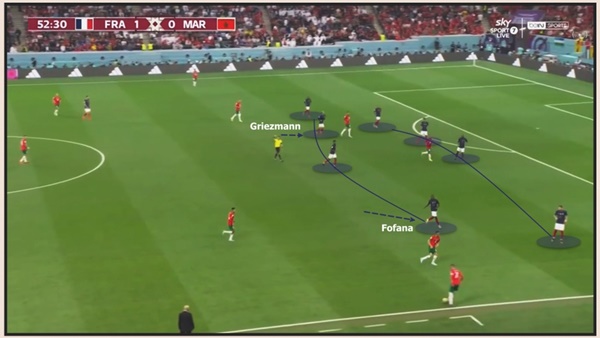Morocco tấn công vào khoảng trống sau lưng hậu vệ trái của Pháp.