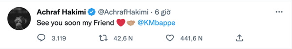 “Gặp lại cậu sớm nhé, bạn tôi”, Hakimi viết trên trang cá nhân và đính kèm tài khoản của Mbappe vào dòng trạng thái. Cả hai là đồng đội và bạn bè thân thiết tại PSG. Hakimi và Mbappe sẽ đụng độ nhau khi Morocco chạm trán Pháp tại bán kết World Cup 2022.