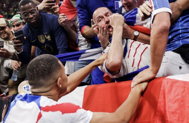 Trong khi tập dứt điểm, Kylian Mbappe vô tình đưa trái bóng đi trúng mặt một người hâm mộ đứng phía sau khung thành tại sân Al Bayt. Cú sút mạnh của Mbappe khiến người đàn ông trung niên bị đau ở vùng mũi.
