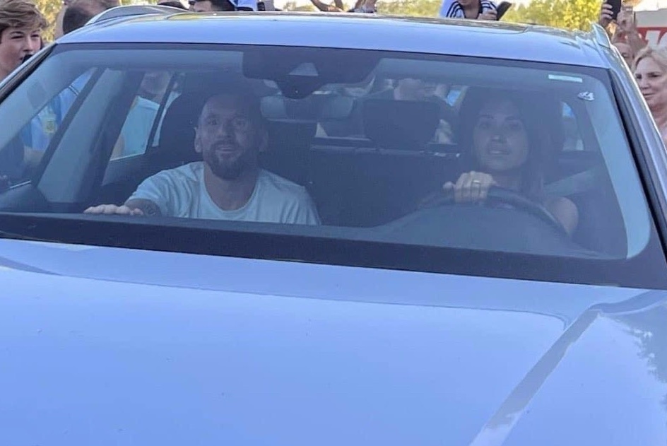 BongDa.com.vnHàng trăm người hâm mộ vây quanh chiếc xe chở Lionel Messi về quê Rosario. Đáng chú ý, người cầm lái chiếc xe là bà xã Antonella của anh chàng.