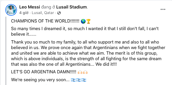 Trên trang cá nhân, El Pulga chia sẻ: “Vô địch thế giới.