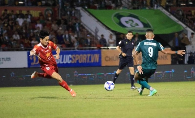 Lương Xuân Trường tung đường chuyền “dọn cỗ” vào trung lộ. Tại đây, tiền vệ Trần Minh Vương đã có pha xử lý đẳng cấp, khéo léo loại bỏ hai hậu vệ đối phương trước khi dứt điểm tinh tế, mở tỷ số 1-0 cho đội chủ nhà.