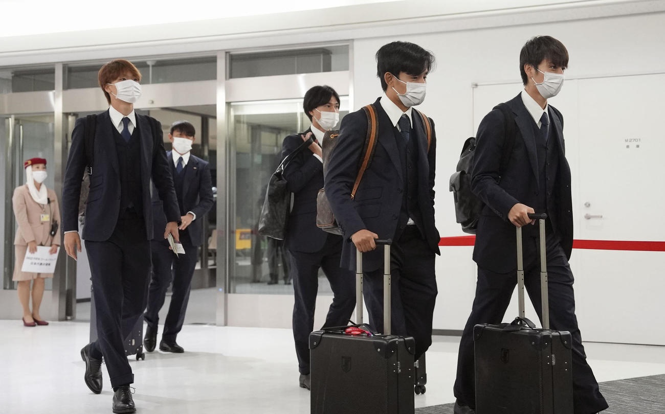 Các cầu thủ Nhật Bản diện bộ vest đen truyền thống trong những chuyến đi thi đấu. Takumi Minamino vẫn tỏ vẻ trầm ngâm, có phần tiếc nuối khi mở đầu loạt sút luân lưu không thuận lợi của đội nhà.