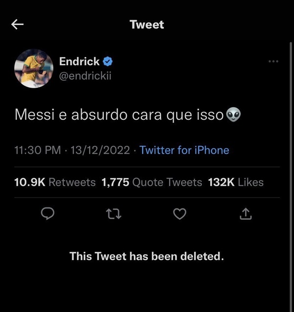 Đoạn tweet khen Messi của Endrick nhanh chóng bị xóa.