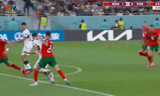Phút 45+2, Bruno Fernandes đột phá vào vùng cấm Morocco và bị ngã sau tác động từ Achraf Hakimi. Cầu thủ Bồ Đào Nha cho rằng họ phải được hưởng phạt đền nhưng cả trọng tài chính Facundo Tello lẫn tổ VAR đều không có bất kỳ phản ứng nào.