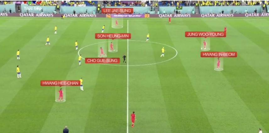 Tiền đạo của Wolves cùng với Cho Gue-sung và Son Heung-min tạo ra “hàng rào” pressing đầu tiên ngay khi các hậu vệ Brazil có bóng. Trong khi đó, tiền vệ Lee Jae-sung xuất phát ở cánh phải nhưng có xu hướng bó vào trong, hỗ trợ bộ đôi tiền vệ trung tâm.