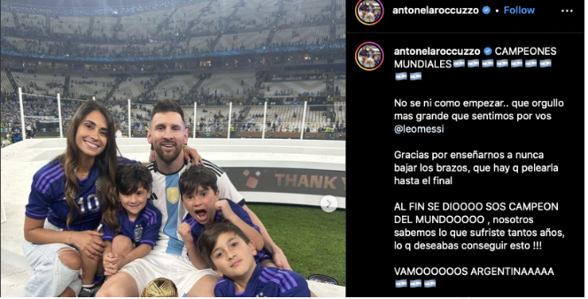 “Nhà vô địch thế giới! Em thậm chí không biết phải bắt đầu như thế nào. Cả gia đình tự hào về anh, Leo Messi”, bà mẹ 3 con viết trên trang cá nhân. “Cảm ơn anh đã dạy chúng ta khái niệm không bao giờ bỏ cuộc, rằng chúng ta phải chiến đấu cho đến phút cuối cùng. Cuối cùng, giấc mơ thành hiện thực. Anh là nhà vô địch World Cup”.