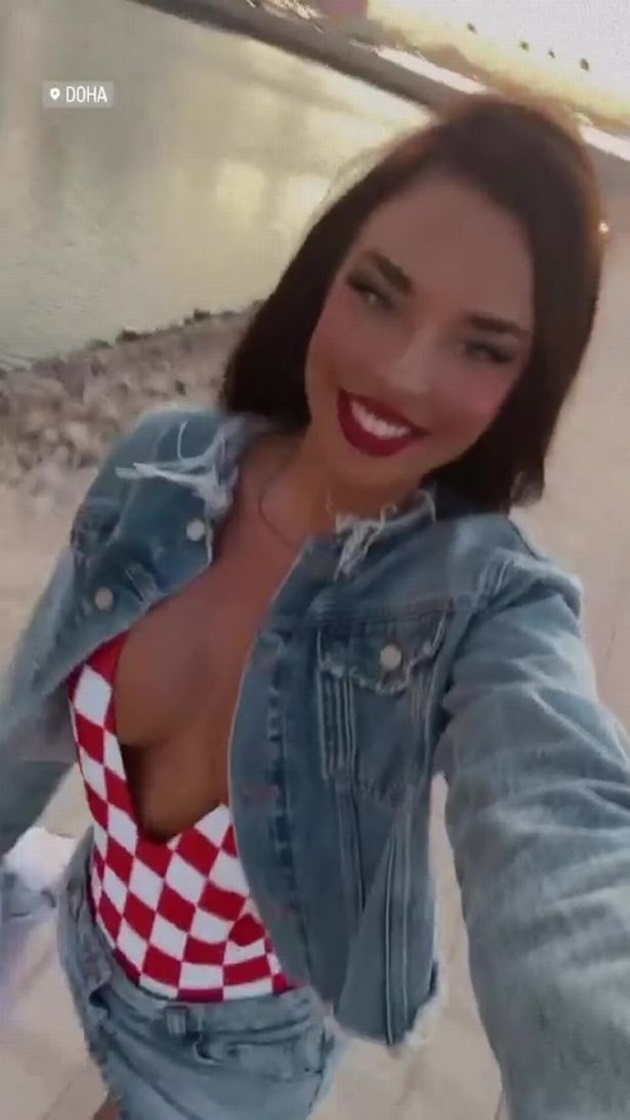 Ivana Knoll ban đầu khiến người hâm mộ kinh ngạc khi cô mặc một chiếc áo hoodie hở hang in hình lá cờ Croatia ở trận khai màn của đội nhà trước Maroc, tại sân Al-Bayt.