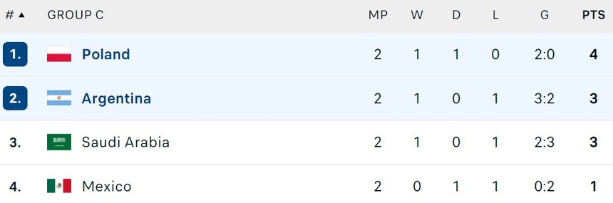 Sau 2 lượt trận, Argentina có 3 điểm, đứng thứ 2 tại bảng C với 1 điểm kém hơn Ba Lan. Saudi Arabia có 3 điểm nhưng đứng thứ 3 do kém hiệu số (-1 so với +1), trong khi Mexico đứng cuối bảng với 1 điểm.
