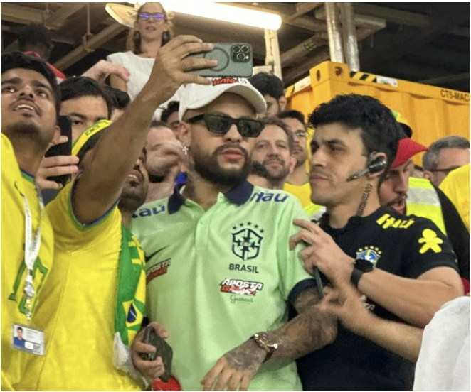 Người đàn ông đội mũ lưỡi trai, đeo kính râm cùng áo của tuyển Brazil xuất hiện trên khán đài. Thậm chí, anh còn bố trí một vài người đi cạnh như thể vệ sĩ.