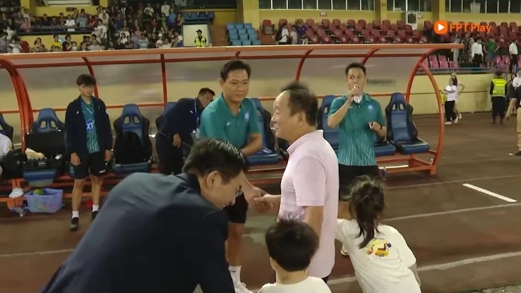 Trên khán đài, bầu Hiển cùng ban lãnh đạo Hà Nội FC không giấu được sự thất thần khi chứng kiến đội nhà liên tục nhận bàn thua. Ngay sau tiếng còi mãn cuộc, vị doanh nhân này đã có hành động bất ngờ khi dẫn hai cháu nội xuống sân. Ông không chỉ dành lời động viên cho các cầu thủ Hà Nội FC mà còn nồng nhiệt chúc mừng chiến thắng của Thép xanh Nam Định.