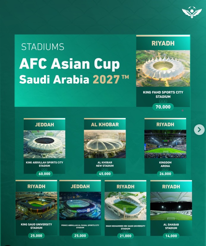 Asian Cup 2027 diễn ra tại Saudi Arabia.Chốt thời gian diễn ra Asian Cup 2027Liên đoàn Bóng đá châu Á (AFC) đã chính thức ấn định thời gian diễn ra Asian Cup 2027 từ ngày 7/1 đến 5/2/2027. Giải đấu sẽ được tổ chức tại Saudi Arabia, với các trận đấu diễn ra tại ba thành phố lớn gồm Riyadh, Jeddah và Al Khobar.Tại thủ đô Riyadh, năm sân vận động sẽ được sử dụng, bao gồm King Fahd Sports City, King Saud University, Imam Mohammed Ibn Saud University, Kingdom Arena và sân Al Shabab. Ngoài ra, Jeddah đóng vai trò quan trọng với hai sân King Abdullah Sports City và Prince Abdullah Al Faisal Sports City, trong khi thành phố Al Khobar góp mặt với SVĐ Al Khobar.