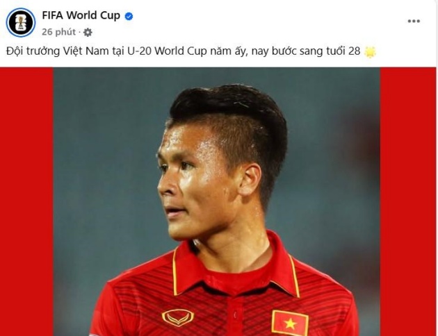 Lời chúc từ FIFA dành cho Quang Hải.Ngày 12/4, tiền vệ Nguyễn Quang Hải chính thức bước sang tuổi 28.Nhân dịp này, trang fanpage chính thức của Liên đoàn Bóng đá Thế giới (FIFA) đã gửi lời chúc mừng sinh nhật tới ngôi sao người Việt, kèm theo hình ảnh anh thi đấu tại VCK U20 World Cup 2017 cùng dòng chú thích: “Đội trưởng của Việt Nam tại kỳ U20 World Cup năm ấy, giờ đã 28 tuổi.”Đó là dấu mốc không thể quên trong lịch sử bóng đá Việt Nam, khi U20 trở thành đội tuyển nam đầu tiên và duy nhất đến thời điểm hiện tại giành quyền góp mặt tại một vòng chung kết World Cup sân 11 người.