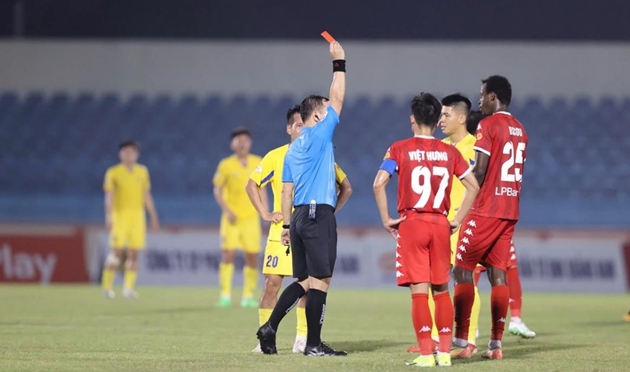Nguyễn Đình Triệu không hài lòng với tấm thẻ đỏ của đồng đội.Ở trận đấu thuộc khuôn khổ vòng 15 V-League, Hải Phòng đã đánh bại Quảng Nam với tỷ số 2-1 để tạm thời vươn lên vị trí thứ 8 trên bảng xếp hạng. Thầy trò ông Chu Đình Nghiêm sớm tạo lợi thế với hai bàn thắng của Văn Tới và Tuấn Anh, tuy nhiên, vào cuối trận, Hoàng Vũ Samson rút ngắn tỷ số cho đội chủ nhà.