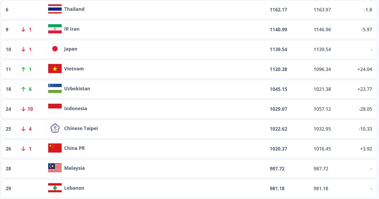 Indonesia rơi 10 bậc trên BXH FIFAFIFA vừa cập nhật bảng xếp hạng tháng 10 dành cho Futsal nữ. Đáng chú ý khi đội tuyển Việt Nam đã tăng 2 bậc lên vị trí thứ 11 thế giới. Đứng thứ 4 châu Á, xếp sau những Thái Lan hạng 6, Iran thứ 9 và Nhật Bản đứng thứ 10.Top 10 châu Á trên bảng xếp hạng FIFA tháng 10/2024. Ảnh chụp màn hình.Philippines cũng tăng 2 bậc ở bảng xếp hạng tháng này lên vị trí thứ 59 thế giới. Trong khi đó Indonesia đã rơi 10 bậc từ vị trí thứ 14 xuống 24 trên bạng xếp hạng FIFA Futsal dành cho nữ.