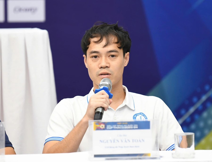 HLV Kim Sang-sik đã gọi Phan Văn Đức (Công An Hà Nội) thế chỗ Nguyễn Văn Toàn vì cầu thủ thuộc biên chế Nam Định dính chấn thương.Điều đó khiến sự xuất hiện của cựu sao Hoàng Anh Gia Lai tại buổi họp báo trước thềm trận tranh Siêu Cup Quốc gia sẽ diễn ra hôm 31/8 tới nhận được nhiều chú ý.Văn Toàn trả lời câu hỏi từ truyền thông. Ảnh: Nam Định FC.