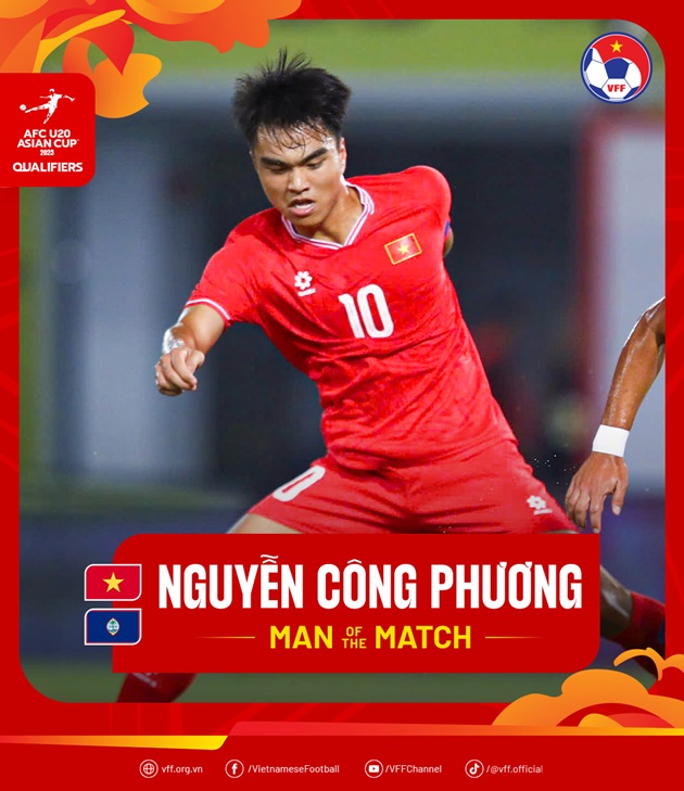 Nguyễn Công Phương lại giành giải Cầu thủ xuất sắc nhất trậnU20 Việt Nam dù không có màn trình diễn quá ấn tượng vẫn dễ dàng giành chiến thắng 3-0 trước U20 Guam ở lượt trận ngày hôm nay 25/9, thuộc khuôn khổ bảng A vòng loại U20 châu Á 2025.Nguyễn Công Phương lần thứ 2 liên tiếp giành giải Cầu thủ xuất sắc nhất trận. Ảnh: VFF.Với 1 pha sút phạt thành bàn cùng màn trình diễn nổi bật trước U20 Guam, AFC tiếp tục vinh danh Nguyễn Công Phương là Cầu thủ xuất sắc nhất trận, theo kênh truyền thông của Liên đoàn bóng đá Việt Nam. Cầu thủ thuộc biên chế Thể Công Viettel cũng đã giành được phần thưởng này sau khi vào sân từ ghế dự bị và tỏa sáng giúp U20 Việt Nam đánh bại U20 Bhutan ngày ra quân.