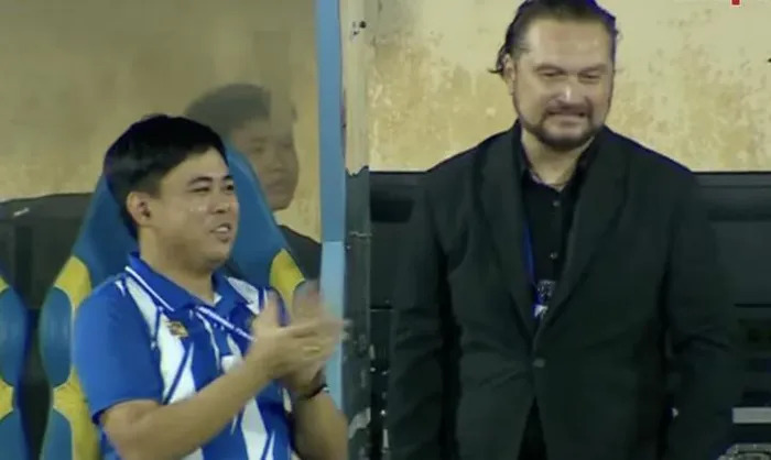 Phản ứng của Giám đốc và HLV Thanh Hóa khi bị từ chối penalty. Ảnh: VTC News.Đáng chú ý, khi chứng kiến trọng tài Muhammad Nazmi Bin Nasaruddin từ chối quả penalty cho Thanh Hóa sau khi Rimario té ngã, Giám đốc điều hành Cao Hoàng Đức đã vỗ tay và làm khuôn mặt tươi cười, một biểu hiện cho thấy ông không đồng tình với quyết định của vị ‘vua áo đen’.Trong khi đó, HLV Velizar Popov cũng thể hiện biểu cảm chua chát khi đội nhà mất đi cơ hội được hưởng quả đá 11m.
