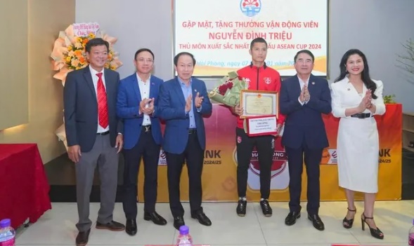 Nguyễn Đình Triệu, sinh năm 1991, gia nhập CLB Hải Phòng vào năm 2022 và ra mắt V.League ở tuổi 31. Dưới sự dẫn dắt của HLV Chu Đình Nghiêm, anh nhanh chóng hoàn thiện kỹ năng và trở thành “người gác đền” đáng tin cậy. Đình Triệu cũng có bước tiến lớn khi được gọi lên đội tuyển quốc gia và ra mắt trong trận giao hữu với Palestine vào tháng 9/2023.Tại ASEAN Cup 2024, thủ môn của CLB Hải Phòng thi đấu chính thức 6/8 trận, góp phần không nhỏ vào thành tích bất bại của đội tuyển. Đặc biệt, trong hai trận bán kết với Singapore và hai trận chung kết với Thái Lan, sự chắc chắn của Đình Triệu đã giúp Việt Nam giành chức vô địch sau 8 trận đấu đầy thuyết phục.Ghi nhận những đóng góp của Nguyễn Đình Triệu, Chủ tịch UBND TP Hải Phòng đã ký quyết định trao tặng Bằng khen và phần thưởng trị giá 550 triệu đồng, bao gồm 500 triệu từ nguồn xã hội hóa và 50 triệu từ ngân sách thành phố. Đây là sự động viên lớn đối với cá nhân Đình Triệu và CLB Hải Phòng.Phát biểu tại buổi lễ, Bí thư Thành ủy Hải Phòng Lê Tiến Châu biểu dương tinh thần thi đấu và sự nỗ lực không ngừng của Đình Triệu. Bí thư cũng nhấn mạnh vai trò quan trọng của tinh thần đoàn kết tập thể giữa các cầu thủ trong CLB và đội tuyển, giúp tạo nên thành công lớn tại giải đấu.Về phần mình, Nguyễn Đình Triệu bày tỏ lòng biết ơn sâu sắc đến lãnh đạo thành phố, CLB và đồng đội. Anh khẳng định, thành tích cá nhân không thể tách rời thành công chung của toàn đội và cam kết sẽ tiếp tục nỗ lực rèn luyện để hoàn thiện bản thân hơn nữa.Buổi lễ vinh danh không chỉ là sự công nhận xứng đáng cho Đình Triệu mà còn là nguồn động viên lớn, khích lệ tinh thần cho các vận động viên khác trong hành trình mang vinh quang về cho bóng đá Việt Nam.
