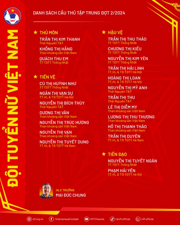 Tuyển nữ sang Trung Quốc du đấuNgày hôm nay 7/10, kênh truyền thông chính thức của Liên đoàn bóng đá Việt Nam (VFF) đã đăng tải thông tin về danh sách tập trung tháng 10 của đội tuyển nữ quốc gia. Cũng theo nguồn tin trên, ở đợt tập trung lần này, chuyên gia thể lực Cedric Roger sẽ trở lại nhiệm vụ hỗ trợ HLV Mai Đức Chung, cùng với các trợ lý Đoàn Minh Hải, Đoàn Thị Kim Chi, Nguyễn Thị Kim Hồng và Nguyễn Thị Ngọc Anh. Danh sách đội tuyển nữ Việt Nam tập trung tháng 10/2024. Ảnh: VFF.