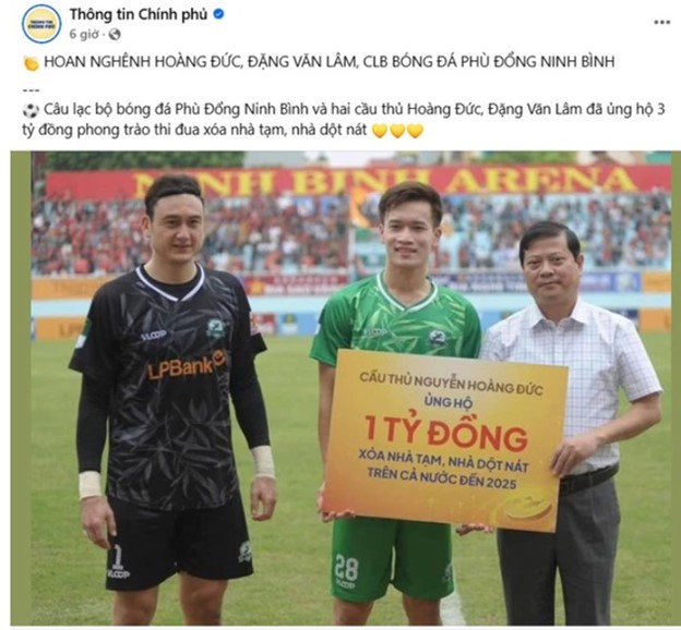 Chiều 3/11, CLB Phù Đổng Ninh Bình có chiến thắng thuyết phục 2-0 trước Long An trong khuôn khổ giải hạng Nhất 2024-2025. Sau trận đấu, ngôi sao của đội bóng – tiền vệ Hoàng Đức – đã có nghĩa cử cao đẹp khi đóng góp 1 tỷ đồng vào chương trình “Mái ấm cho đồng bào tôi”, nhằm chung tay xóa bỏ những căn nhà tạm, nhà dột nát trên khắp cả nước.Văn Lâm, Hoàng Đức cùng CLB Phù Đổng Ninh Bình được vinh danh. Ảnh chụp màn hình.