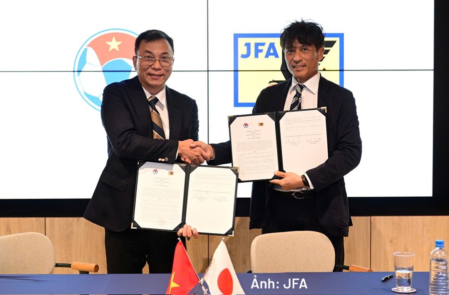 VFF hợp tác với Nhật BảnKênh truyền thông chính thức của Liên đoàn bóng đá Việt Nam cho biết chiều nay 18/9 đã diễn ra lễ ký kết thỏa thuận hợp tác giữa VFF và Liên đoàn bóng đá Nhật Bản (JFA).Đây là sự tiếp nối chương trình hợp tác toàn diện đã được hai Liên đoàn bóng đá quốc gia triển khai thực hiện hiệu quả trong 10 năm vừa qua, kể từ lần ký kết đầu tiên vào năm 2014 cho đến nay.Chủ tịch LĐBĐVN Trần Quốc Tuấn và Chủ tịch LĐBĐ Nhật Bản Miyamoto Tsuneyasu. Ảnh: JFA.