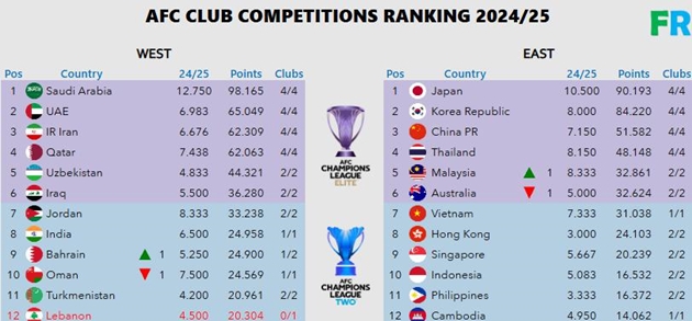 Kể từ năm 2022, hệ thống này đã điều chỉnh tính điểm trong tám năm, với điểm số từ các mùa giải trước đó giảm dần bằng cách áp dụng hệ số giảm.Theo chuyên trang Footy Ranking, bóng đá Việt Nam đang xếp thứ 7 ở khu vực Đông Á với 31.038 điểm, vừa được cộng thêm 7.333 điểm. Ở một diễn biến khác, nhờ thành tích ấn tượng của các đại diện J-League, Nhật Bản chễm chệ trên ngôi đầu với 90.193 điểm.Bên bảng xếp hạng khu vực Tây Á, với sự nổi lên của Saudi Pro League suốt thời gian qua, không có gì khó hiểu khi Ả Rập Xê Út là đất nước đứng đầu.Thành tích đứng thứ 7 của bóng đá Việt Nam có phần lớn công lao từ nỗ lực của câu lạc bộ Nam Định, đại diện duy nhất của Việt Nam tham dự AFC Champions League 2. Thầy trò Vũ Hồng Việt vừa đánh bại Tampines Rovers trên sân Thiên Trường với tỷ số 3-2.Nếu muốn cải thiện thành tích trên bảng xếp hạng này, các đại diện ưu tú của V-League như Công An Hà Nội hay Hà Nội cần dành sự quan tâm nhiều hơn cho những giải đấu thuộc AFC mỗi khi giành quyền tham dự.