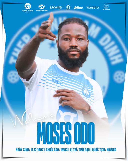 Với việc Nguyễn Xuân Son đã có quốc tịch Việt Nam, CLB Nam Định sẽ được quyền sử dụng thêm một ngoại binh nữa và họ đã ngay lập tức công bố cái tên mới gia nhập đội, đó là tiền đạo Moses Odo.Cụ thể, trang Fanpage của CLB Nam Định cung cấp thông tin về chân sút người Nigeria cho biết: “Moses Odo sinh ngày 11.12.1997, quốc tịch Nigeria. Anh sở hữu chiều cao 1m83, thuận chân phải, thi đấu ở vị trí tiền đạo.Tân binh vừa cập bến Nam Định, Moses Odo. Ảnh: CLB Nam Định.